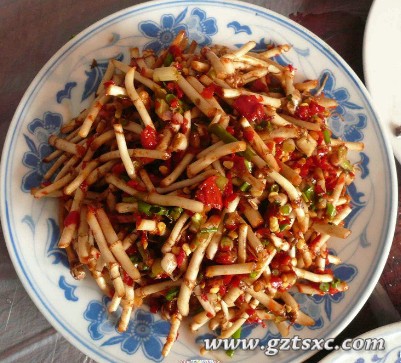 折耳根書面語為魚腥草也是蕺菜的別名,三白草料,多年生草本。生長在山野陰濕的地方,莖高尺余,細(xì)長,蔓生于地上,初夏開小花。莖葉均有強烈的腥臭。葉與地下部分的草根均可作藥用。遵義當(dāng)?shù)貙Ⅳ~腥草作為酒席臺上的一道小菜,有的吃葉,有的吃葉和根,而遵義僅吃根。看著切成寸段的魚腥草,乍看像毛草根,入口腥臭,有點像死魚味。同行問,這腥味怎么不將它除去呢?主人笑道,吃的就是這魚腥味。聽說此草有藥用,忍不住多動幾筷,腥歸腥,但挺爽口的。