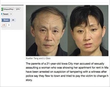 騰訊網(wǎng)訊 中國俗語稱“可憐天下父母心”,但有時(shí)父母對兒女的護(hù)犢之情可能超越法律的界限。美國愛荷華州21歲中國留學(xué)生唐某(音譯)因涉嫌強(qiáng)奸女生被捕。他的父母聞?dòng)嵹s到美國后,試圖賄賂受害女生,讓其更改口供。目前,愛荷華州警方已對唐鵬及其父母均提起起訴。