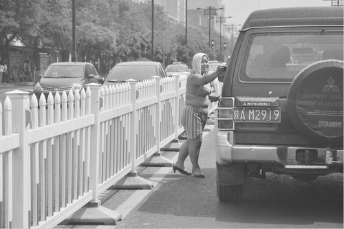 昨日下午三點左右,當(dāng)記者一行開車由北關(guān)行駛到北大街十字至西華門十字的時候,突然看到前方有一位大約四十歲左右的婦女穿行在車流中,對每一位路過此處路段的車輛進(jìn)行“收費”,只見她熟練地敲每一輛車駕駛座旁邊的車窗,然后向司機索取費用,而司機們大都無奈地或多或少地向她付費。