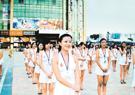 這組酒店從業(yè)人員身著迷彩裝和護士裝在酒店門口軍訓的照片在網(wǎng)上熱傳后,有不少網(wǎng)友稱其為“東莞妹大閱兵”,調侃桑拿業(yè)競爭激烈。