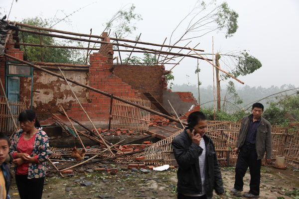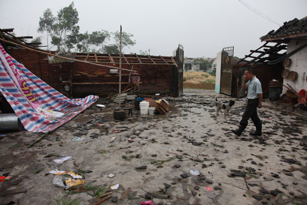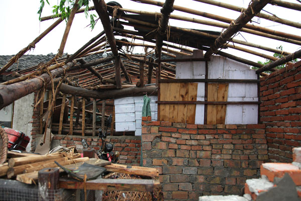 5月9日上午,眉山市東坡區(qū)富牛鎮(zhèn)一農(nóng)戶面對(duì)龍卷風(fēng)襲擊后的養(yǎng)雞場(chǎng),欲哭無淚。