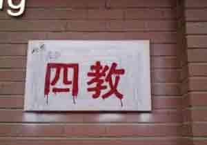 被潑漆后印上“四教”的銘牌,左上角被人寫上“我愛清華”