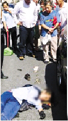 第一條微博是在當(dāng)天下午2點半發(fā)出,他用“震驚!痛恨!悲傷!”三個濃烈色彩的詞打頭,詳述了事發(fā)經(jīng)過:“我路經(jīng)東安路,突然看見馬路中央一路過來一男一女倆收費員一前一后追堵一輛奧迪車,女的在前撐住車頭不讓走,男的在左邊想拉車停下。奧迪車眼見擺脫不了他倆,出乎意料地猛然加速沖撞了過去,可憐女收費員瞬間被軋入了車底,卡在右后輪下,據(jù)說沒了心跳。”在這段文字下面,兩張受害人倒在血泊中的照片觸目驚心。