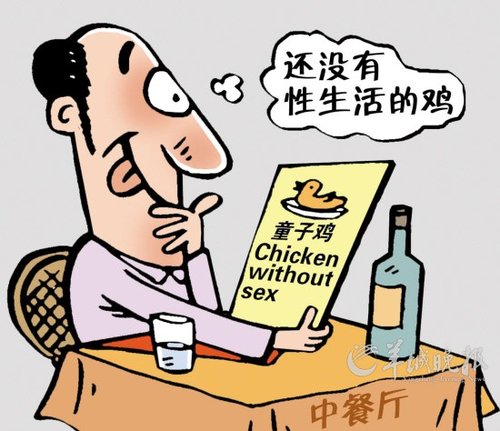 而此前曾被翻譯成Chicken without sex(還沒(méi)有性生活的雞)的童子雞此次被正名為Spring chicken(直譯為春雞)。陳琳告訴記者,將童子雞的英文名稱定為Spring chicken是符合中英文語(yǔ)言特征的。童子雞的中文含義是沒(méi)有交配的小雞,而英語(yǔ)中一般用春、夏、秋、冬來(lái)形容小動(dòng)物的年齡特征,初生到性成熟前的雞一般用Spring chicken來(lái)表示。