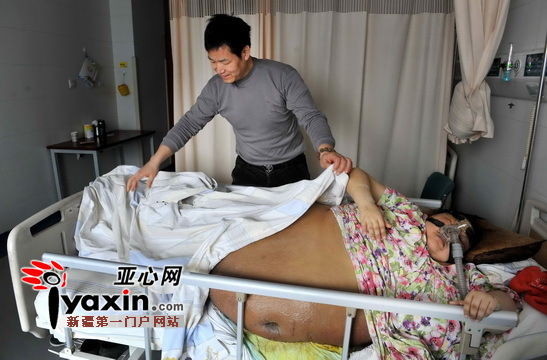 2月5日,蘭州軍區烏魯木齊總醫院的心血管內科,已經無法動彈的楊麗娟帶著呼吸機側躺在病床上。由于體重太重,長期臥床,楊麗娟身上有大面積褥瘡。其丈夫韓鐵柱說,每2天給她換一次藥,換藥時,6個男醫生合力才能將她抬起來再放平到另一張床上。