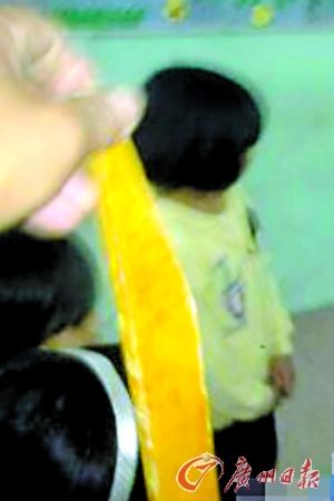 微博上,一張小孩子屁股被打得淤青的圖在微博上熱傳,圖片上顯示,一名孩子屁股兩側都有淤青,其中右側特別嚴重,淤青的面積占了大半部。微博上另外一張圖片則展示了班干部使用的“工具”——一把黃色的尺子。