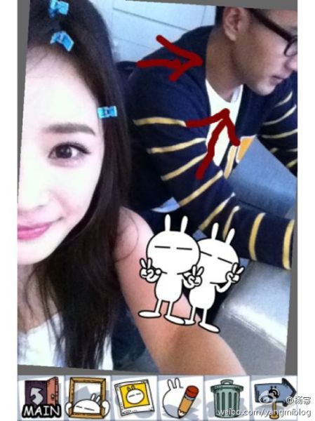楊冪還上傳了一張自拍的與劉愷威一起的照片,照片中楊冪打扮粉嫩,頭上有三個發夾,十分可愛,后面的劉愷威充當背景,沒有發現楊冪在玩自拍,帶著眼鏡低頭在研究什么。楊冪還很有創意的在照片上貼上兩只親密的兔斯基,并涂鴉上兩個小紅箭頭指向劉愷威。
