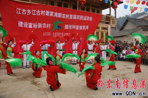本港訊 (彭禮周 特約記者 何洪道)近日,鎮遠縣江古鄉謝家灣新農村舉辦了首屆農民運動會,共有15支村組代表隊參賽,分別進行了籃球、拔河、接力、乒乓球和象棋等賽事的角逐。農民們用自己獨特的方式享受著新農村建設帶來的喜人成果,充分展示了鎮遠農民在建設新農村和構建和諧社會中的良好精神風貌。